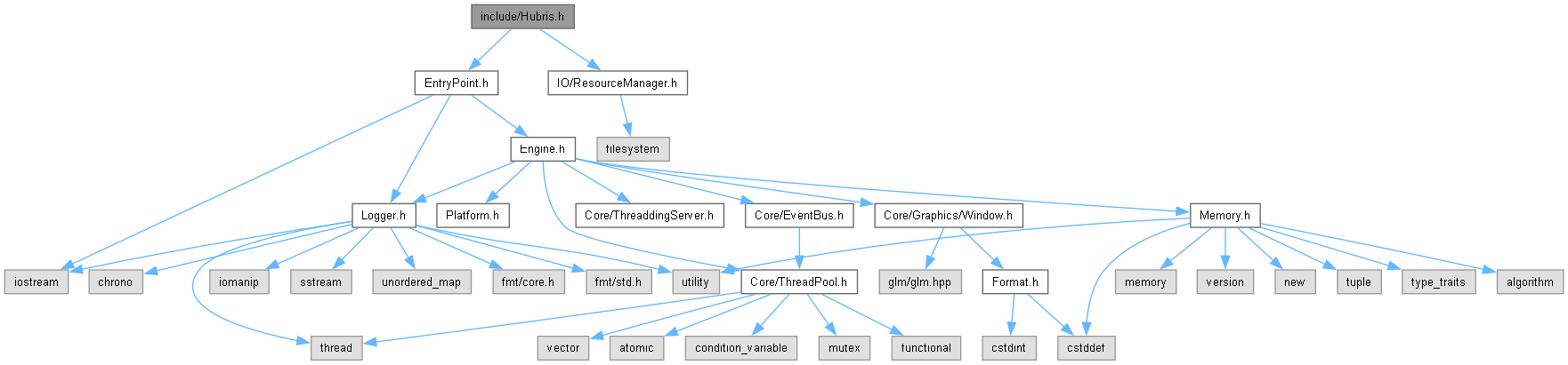 This file includes all the necessairy headers to use the Hubris Engine. If you want to define your own entry point add before this header. More...